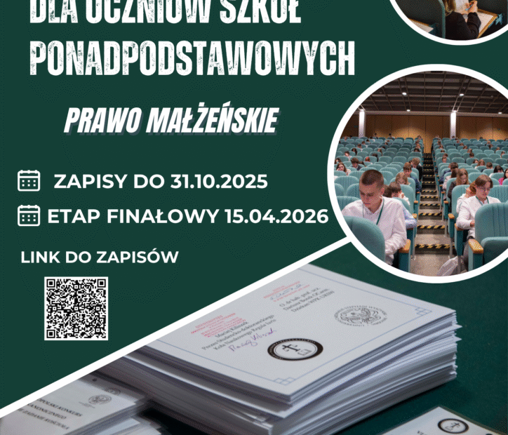 Szanowni Państwo, Drogie Katechetki i Drodzy Katecheci, Studencko-Doktoranckie Koło Naukowe Prawa Kanonicznego Regula Iuris działające na Wydziale Prawa Kanonicznego Uniwersytetu Kardynała Stefana Wyszyńskiego w Warszawie ma zaszczyt zaprosić do udziału w X – Jubileuszowej edycji Ogólnopolskiego Konkursu Prawa Kanonicznego dla Uczniów Szkół Ponadpodstawowych. Tematem tegorocznej edycji jest „Prawo małżeńskie”. Dziesięć lat Konkursu… Dowiedz się więcej »KONKURS PRAWA KANONICZNEGO